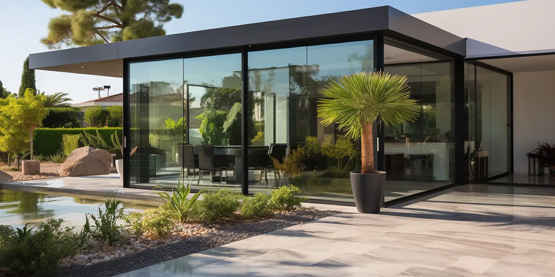 Peut-être avez-vous entendu parler de la véranda sur mesure bioclimatique : elle se distingue de la véranda classique par sa toiture constituée de lamelles orientables manuellement ou motorisées, permettant ainsi de réguler la quantité de lumière et de chaleur à laisser entrer.